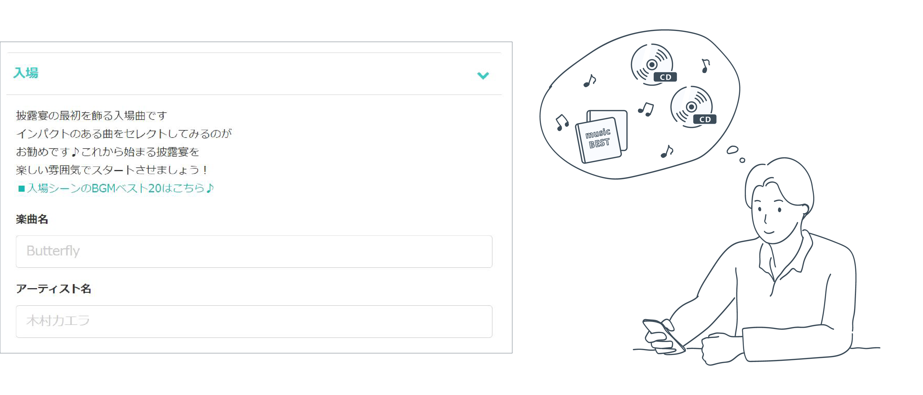 Marrysys内のBGMフォームに披露宴の各シーンで使用したいBGMの曲名とアーティスト名をご入力ください